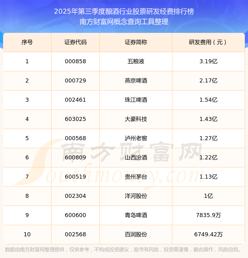 2025年第三季度,釀酒行業(yè)股票研發(fā)經(jīng)費(fèi)排名如下:五糧液(000858)研發(fā)經(jīng)費(fèi)總額高達(dá)3.19億,燕京啤酒(000729)和珠江啤酒(002461)分別位居第二和第三,大豪科技(603025)、瀘州老窖(000568)、山西汾酒(600809)、貴州茅臺(600519)、洋河股份(002304)、青島啤酒(600600)、百潤股份(002568)分別進(jìn)入前十,其研發(fā)經(jīng)費(fèi)總額分別排名第4-10名。