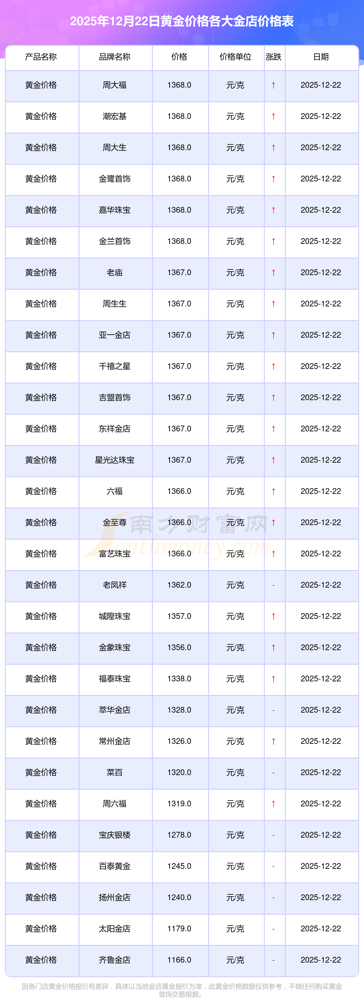 今天是2025年12月22日,周大福、老鳳祥、老廟、周生生、周大福、周大福、周大福、周大福、周大福、周大福、老鳳祥等各大金店品牌黃金價格最新價格如下:周大福1368.0元/克、老鳳祥1362.0元/克、老廟1367.0元/克、周生生1367.0元/克、周大福803.0元/克、周大福1368.0元/克、周大福48400.0、周大福23410.0、周大福43660.0、周大福1199.0元/克、老鳳祥720.0元/克。