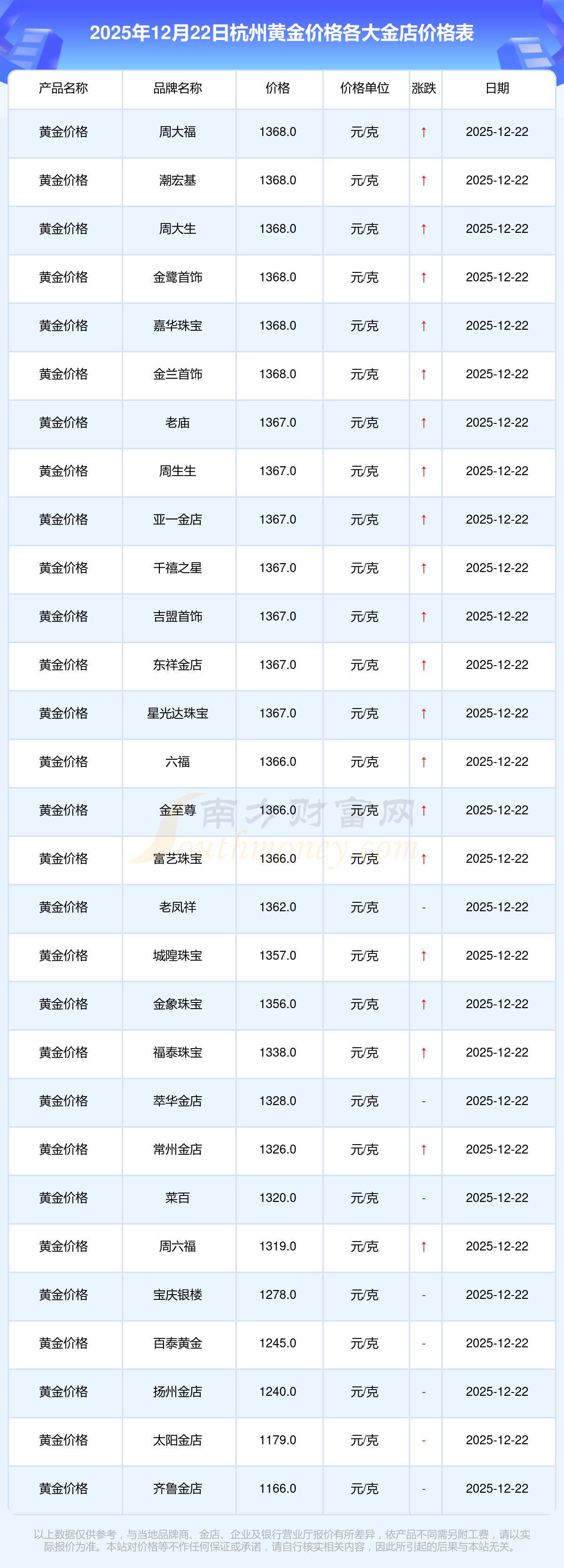 2025年12月22日杭州各大金店黃金價(jià)格最新價(jià)格:周大福1368.0元/克,老鳳祥1362.0元/克,老廟1367.0元/克,周生生1367.0元/克,周大福803.0元/克,周大福1368.0元/克,周大福48400.0,周大福23410.0,周大福43660.0,周大福1199.0元/克,老鳳祥720.0元/克。