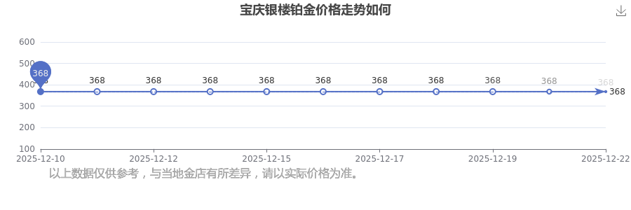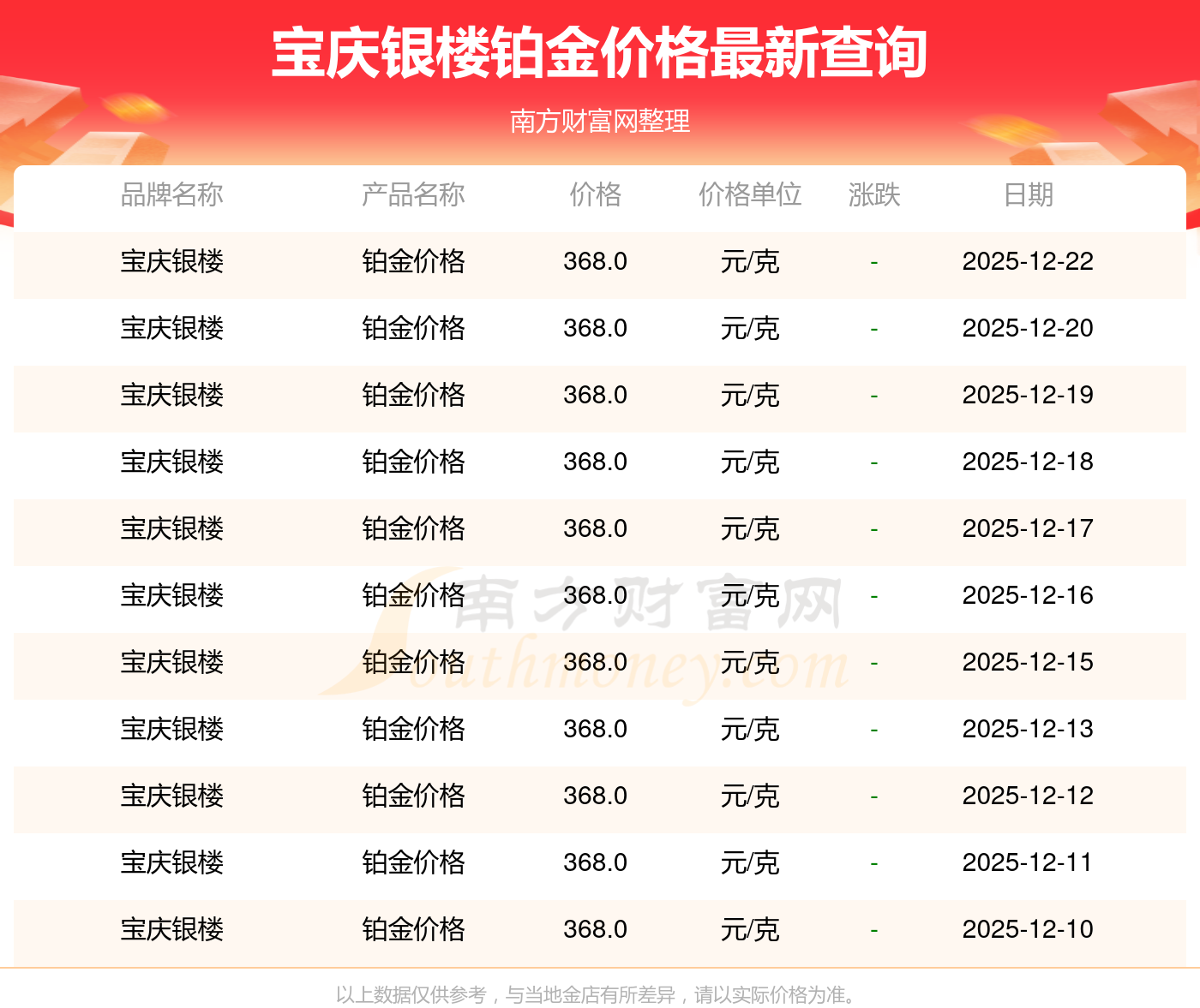 今日(2025年12月22日)寶慶銀樓鉑金價格為368.0元/克。